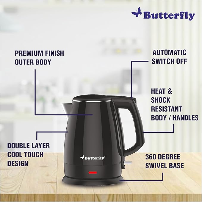 The electric kettle features a double-layer cool touch design and a premium finish outer body for easy handling. Its concealed heating element ensures seamless usage and easy cleaning, while the automatic shut-off function prevents over-boiling. The 360-degree swivel base provides convenient access from any angle.
