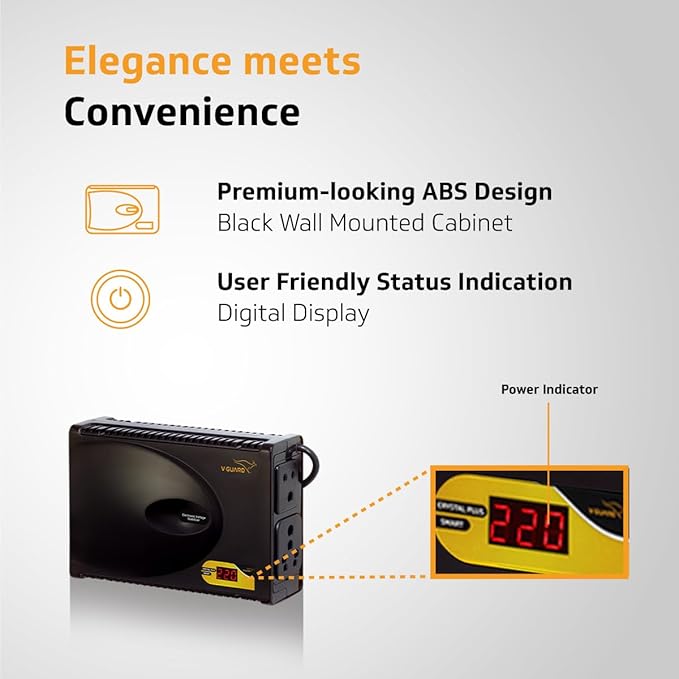 This voltage stabilizer is suitable for smart TVs up to 140 cm, set-top boxes, home theaters, and gaming consoles. It features a 3 A capacity, black ABS cabinet with wall-mounting, and advanced IC technology for better voltage correction, built-in thermal overload protection, and metal oxide varistor spike protection. With a 3-year offsite warranty, it ensures reliable performance with a maximum voltage boost of 40V and bucking of 48V.