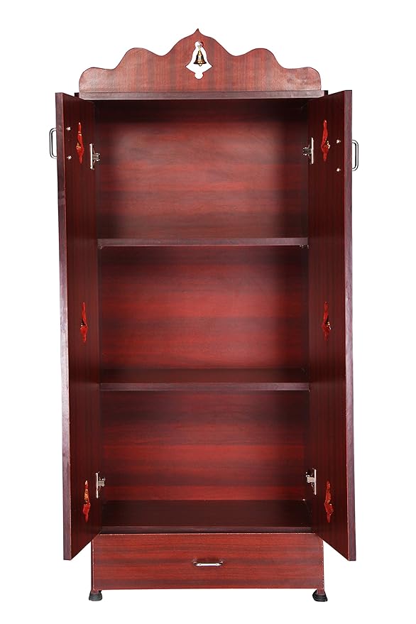 This decorative mandir is crafted from compressed wood and features a drawer for pooja accessories, along with 7 decorative bells, making it an essential addition to every Indian home for worship. The matte-finished god mandir includes spacious shelves to hold traditional idols, giving it a classy and authentic appearance. With a mantra chanting box, this Hindu altar enhances the artistic beauty of your prayer room and can also be used as home office religious decor, making it a perfect gift for Navratri or Diwali. The rosewood finish adds a modern touch to your pooja room, while its stain and termite-resistant properties ensure long-lasting durability. Delivered in a pre-assembled state, this cabinet mandir not only adds aesthetic charm but also promotes holistic development physically, emotionally, and spiritually. Dimensions: Length 24 * Width 12 * Height 53 inches.